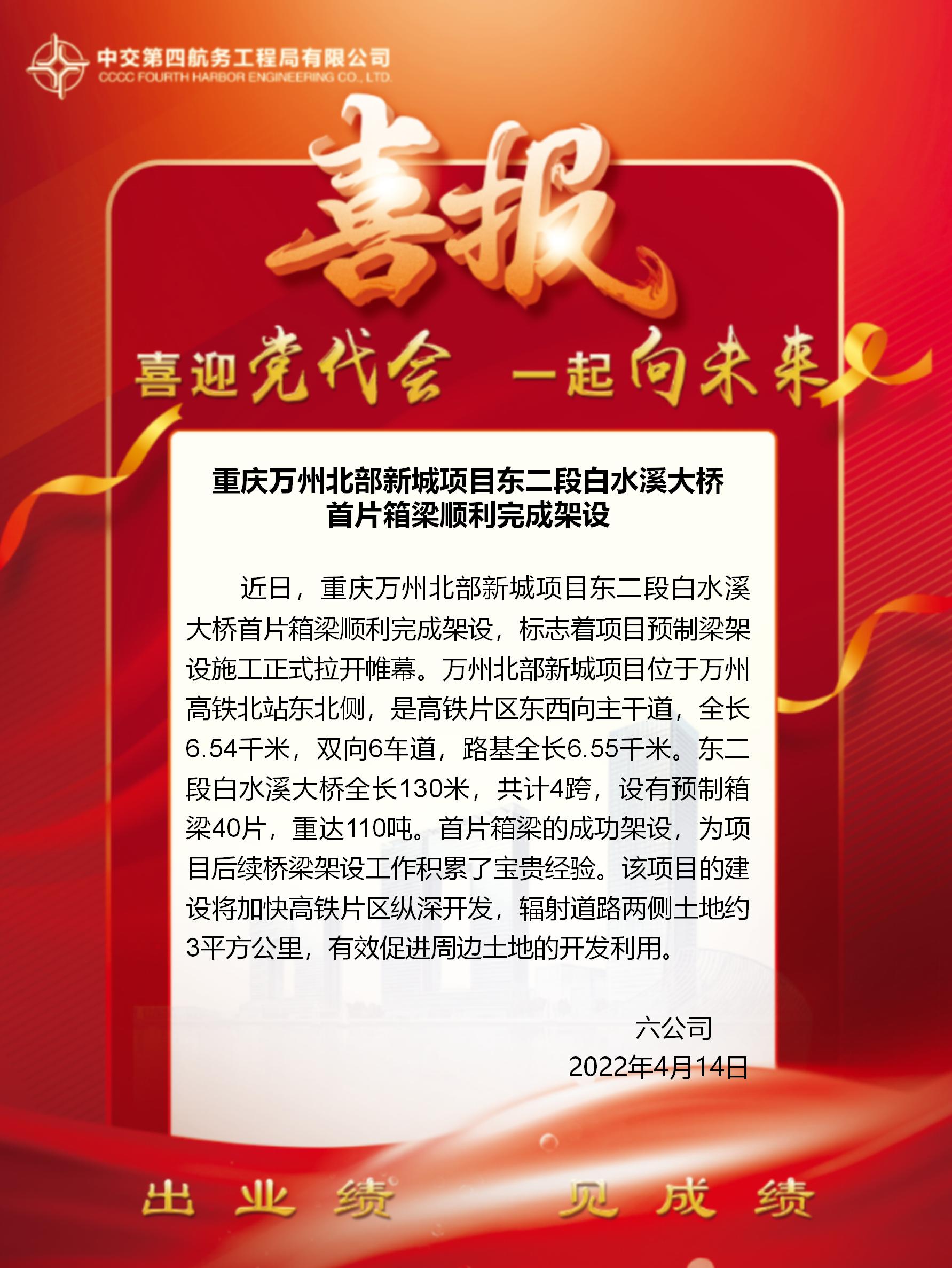 重慶萬州北部新城項目東二段白水溪大橋首片箱梁順利完成架設(shè)