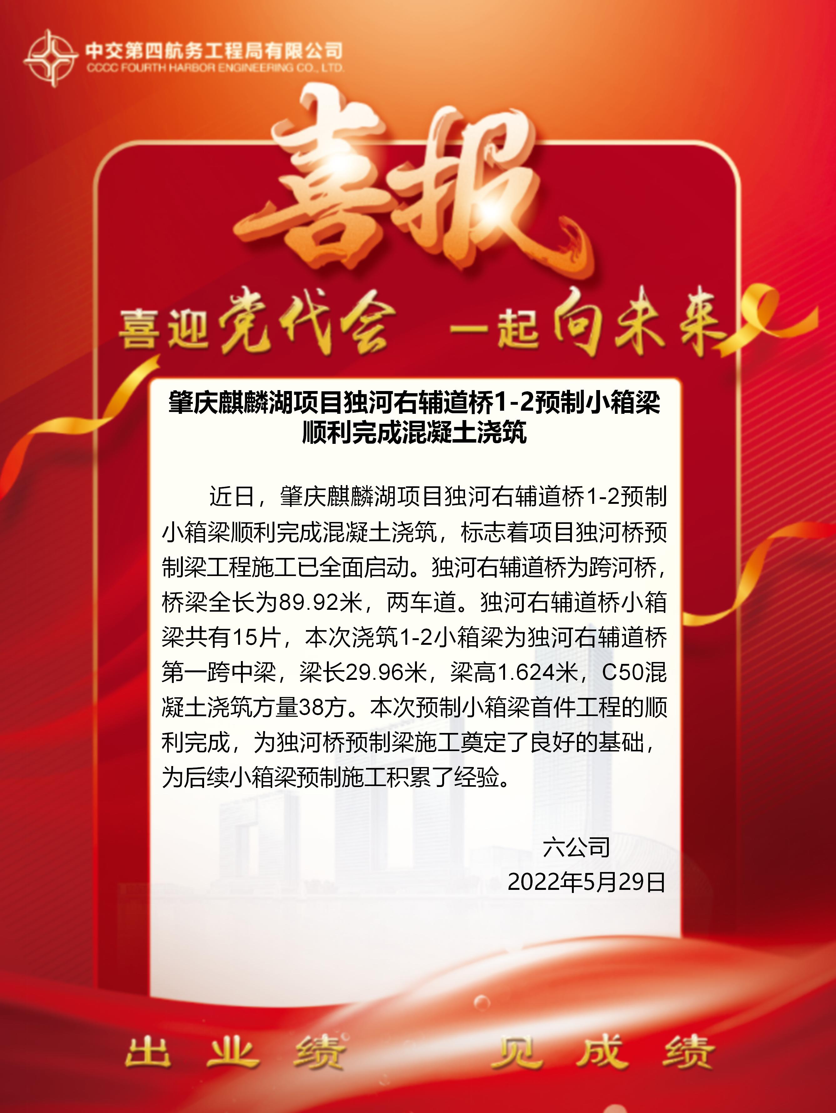 肇慶麒麟湖項目獨河右輔道橋1-2預制小箱梁順利完成混凝土澆筑