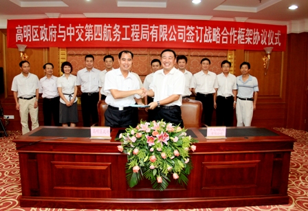 7月20日,四航局與佛山市高明區(qū)政府正式簽署2010-2014年戰(zhàn)略合作框架協(xié)議。四航局董事長梁卓仁、副總經(jīng)理曾繁龍,高明區(qū)委書記馬亮照、區(qū)長唐棣邦等領(lǐng)導(dǎo)出席了簽署儀式,梁卓仁董事長和唐棣邦區(qū)長代表雙方簽署了框架協(xié)議。