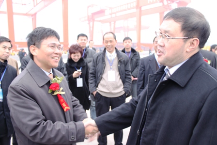 開港儀式后,宜賓市市委書記楊冬生與四航局總經(jīng)理孫國強親切交談。楊冬生書記稱贊四航局在宜賓港建設(shè)中創(chuàng)造了"宜賓速度,四川奇跡",是一支關(guān)鍵時候沖得上、頂?shù)米〉挠碴犖?,并對四航局宜賓項目部保質(zhì)、保量、安全完成開港試營運的重任給予充分肯定和高度贊賞。