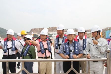 11月3日,國有重點大型企業(yè)監(jiān)事會主席尋寰中、董樹奎、楊堅、熊志軍、王壽君、時希平一行在中交總經(jīng)理部總經(jīng)理林鳴等人的陪同下,考察港珠澳島隧項目桂山島沉管預制廠。