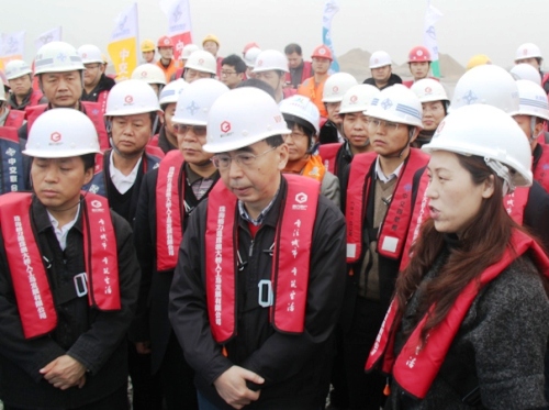 2月12日,廣東省省長朱小丹在中交股份副總裁陳云、四航局總經(jīng)理孫國強(qiáng)、副總經(jīng)理周達(dá)培及業(yè)主、兄弟單位等領(lǐng)導(dǎo)的陪同下,蒞臨港珠澳大橋珠澳口岸人工島項(xiàng)目部視察。