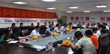 李惠明一行視察了施工現(xiàn)場,了解重要分項工程的建設情況及施工進度,并出席了多哈新港項目部員工座談會。會上,李惠明對項目部全體員工在艱苦環(huán)境中付出的努力給予了肯定,對員工的身心健康和年輕員工的發(fā)展表示關(guān)心和慰問。