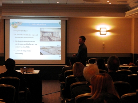 本次會議圍繞水泥基復合材料的耐久性問題展開學術交流與討論。會上,四航研究院黎鵬平博士做了題為“The Correlativity between Exposure Test and Accelerated laboratory Test for concrete Performance of Resistance to Chloride ion”的學術報告,報告主要內容是暴露試驗與室內試驗相關性研究,首次建立了現場耐久性質量控制的室內快速試驗的測試結果與暴露試驗的表觀氯離子擴散系數的關系,引起參會者強烈反響。