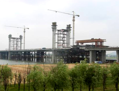 蚌埠市大慶路淮河橋主橋采用先梁后塔工藝,主塔總高68米,其中上塔柱高45米,分11節(jié)段施工。自3月底完成鋼箱梁頂推后開始上塔柱施工以來,在確保安全與質(zhì)量的前提下,最快速度達(dá)4天一節(jié)段,僅用兩個(gè)月就順利實(shí)現(xiàn)了上塔柱封頂目標(biāo)。