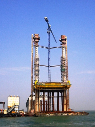 主橋工程是檳城第二跨海大橋全線關(guān)鍵控制性工程,而主塔的施工又是主橋工程建設(shè)的重點、難點。主塔為組合式H型直塔,由下塔柱、橫梁、上塔柱及塔尖組成,索塔高93.6米,下塔柱27.64米,橫梁高5米,上塔柱60.96米。塔柱采用液壓自爬模系統(tǒng)施工,橫梁采用落地大鋼管支架進行施工。