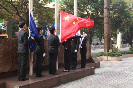 伴隨著《國(guó)歌》、《四航之歌》的鏗鏘旋律,五星紅旗和中國(guó)交建司旗在公司6名旗手護(hù)衛(wèi)下徐徐升起,本部全體員工肅立仰望,向五星紅旗和中國(guó)交建司旗行注目禮,自豪和神圣感油然而生。