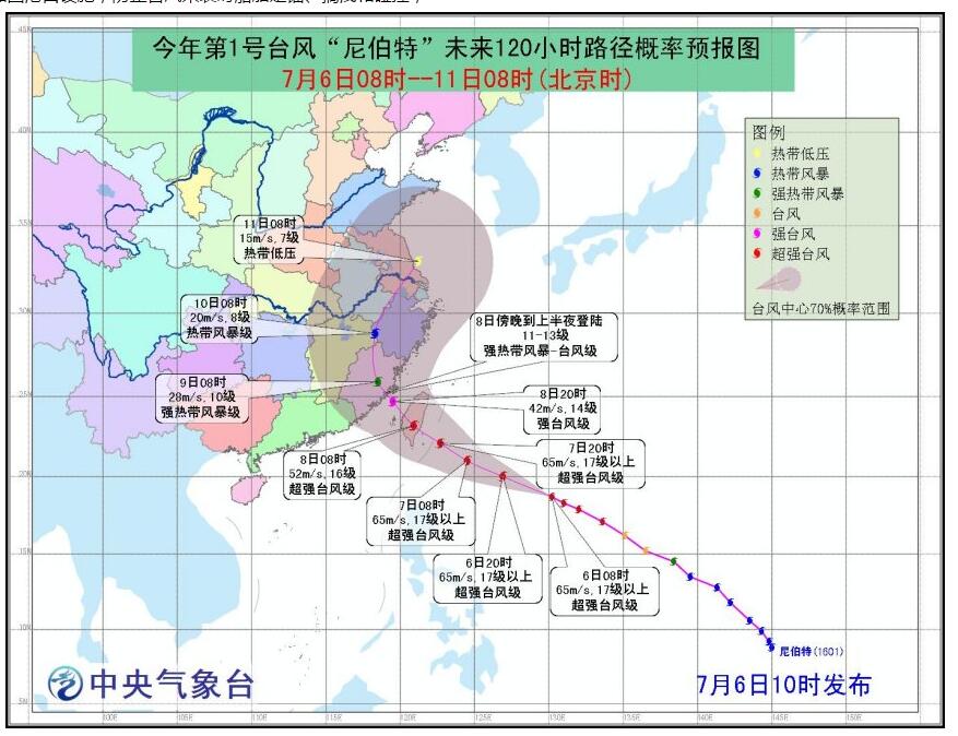 預計 “尼伯特”將以每小時30公里左右的速度向西偏北方向移動,強度變化不大或略有增強,逐漸向臺灣東部沿??拷?,將于7日夜間到8日凌晨登陸臺灣東部沿海(52~60米/秒,16~17級,超強臺風級),登陸臺灣后強度將明顯減弱;之后將穿過臺灣海峽向福建沿??拷?,并于8日傍晚到上半夜登陸福建沿海(30~38米/秒,11~13級,強熱帶風暴級到臺風級)。