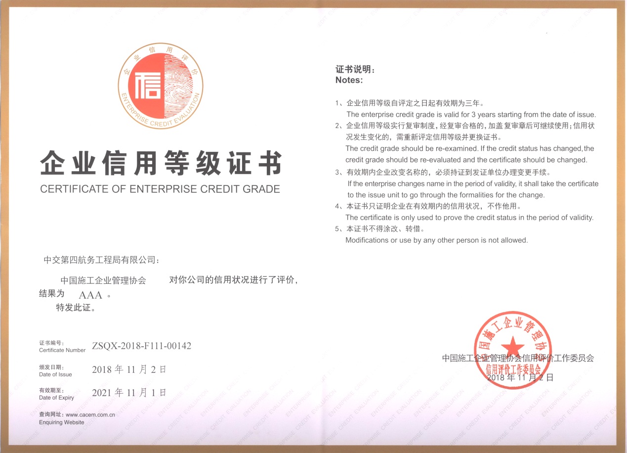 信用等級(jí)證書是市場(chǎng)經(jīng)營(yíng)、評(píng)優(yōu)選優(yōu)等活動(dòng)的重要依據(jù),AAA級(jí)為施工企業(yè)信用評(píng)級(jí)三級(jí)五等中的最高級(jí)別。獲評(píng)中國(guó)施工企業(yè)管理協(xié)會(huì)AAA級(jí)信用企業(yè),充分肯定了四航局誠(chéng)信經(jīng)營(yíng)、創(chuàng)新發(fā)展的綜合實(shí)力,為企業(yè)持續(xù)健康發(fā)展打下了堅(jiān)實(shí)的基礎(chǔ)。