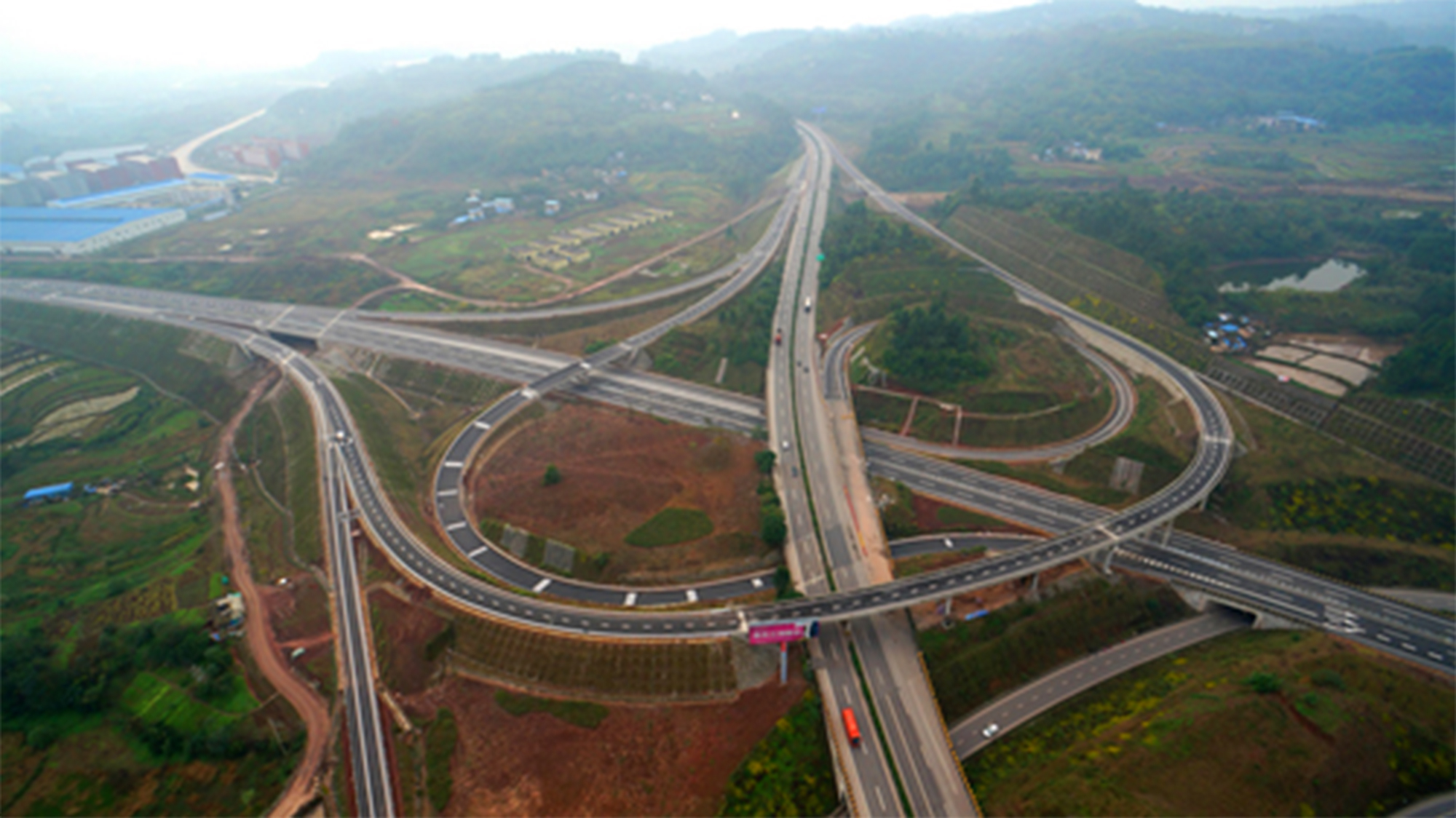 該工程線路西起銅梁城北二龍碑附近,東止渝武高速公路合川南沙溪廟互通,是連接渝遂、渝武高速公路的重要通道,全長(zhǎng)29.34千米,大中橋梁25座,涵洞、通道130座,設(shè)5處互通式立交、1處服務(wù)區(qū)、 3處收費(fèi)站。
