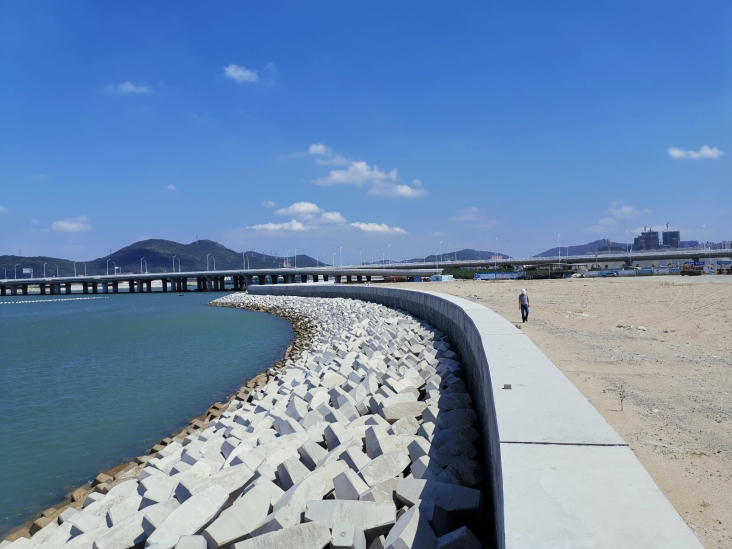 平潭如意湖海堤外側(cè)護(hù)岸工程位于平潭島西南側(cè)、金井灣如意路以西,工程新建斜坡式海堤護(hù)岸1102.49米,陸域形成面積6.75萬平方米,后方設(shè)排水管渠1處。
